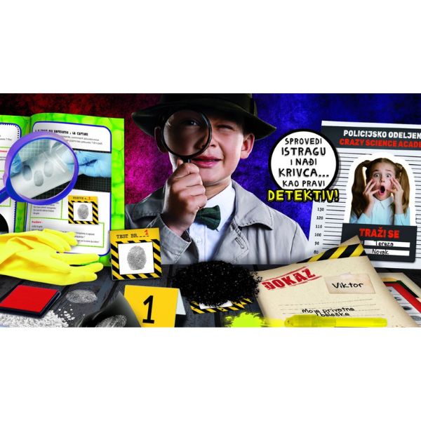 Crazy Science edukativni set – Nauka o detektivima Lisciani pruža deci priliku da se oprobaju u ulozi pravih istražitelja. Komplet sadrži sve što je potrebno za sprovođenje istrage – lupu za ispitivanje tragova, ram za izradu foto robota, listić za otkrivanje otisaka, talk u prahu, četkicu, rukavice, gvozdeni prah i nalepnice za uzimanje otisaka. Tu su i mastilo, kartice za arhiviranje, magična olovka za beleženje tragova i kartice za osumnjičene, što omogućava deci da prate tragove, analiziraju ih i otkriju „krivca“. Ovaj set podstiče logičko razmišljanje, pažnju i analitičke veštine kroz zabavnu i interaktivnu igru.