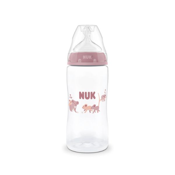 NUK flašica sa kontrolom temperature – Sprečava davanje previše vruće hrane detetu zahvaljujući indikatoru koji menja boju u belu kada je sadržaj pretopao. Napravljena je od visokokvalitetnih, BPA-free materijala, sa originalnom NUK cuclom po uzoru na majčinu bradavicu i Anti-Colic Air sistemom koji smanjuje gutanje vazduha i pomaže bebi da pije bez grčeva. Lako se puni i čisti zbog širokog otvora, dostupna je u različitim veličinama i šarenim dizajnima, i u skladu je sa evropskim standardom EN14350. Pogodna za uzrast 3+ meseca.