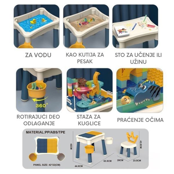 Praktičan i kreativni set koji spaja igru i učenje! Sto ima dvostranu radnu površinu – s jedne strane glatku ploču idealnu za crtanje, pisanje i kreativne aktivnosti, a s druge podlogu za slaganje kocki. Ispod radne ploče nalazi se prostor za odlaganje kocki i dodataka. U kompletu dolazi i udobna stolica prilagođena deci, izrađena od kvalitetne i čvrste plastike. Dimenzije pakovanja: 65.5 × 12 × 45.2 cm. Dimenzije stola: 44.5 × 63.5 × 42 cm. Dimenzije stolice: 28 × 23.5 × 42.5 cm.