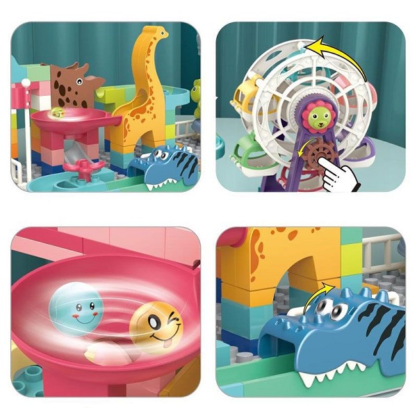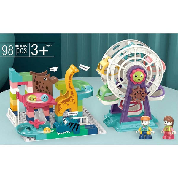 Zabavan i edukativan set od 98 delova koji vodi decu u svet praistorije! Set uključuje dve figure, tobogan, levak, vrtuljak i različite elemente za slaganje, kreirajući pravi mini vašar za igru. Kroz slaganje i manipulaciju kockama deca razvijaju finu motoriku, koordinaciju ruka–oko i kreativnost. Dimenzije pakovanja: 43 × 9 × 30 cm.