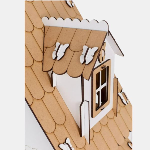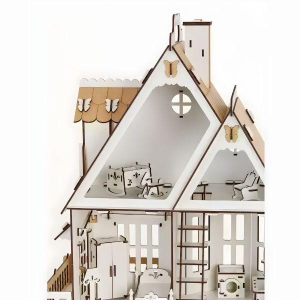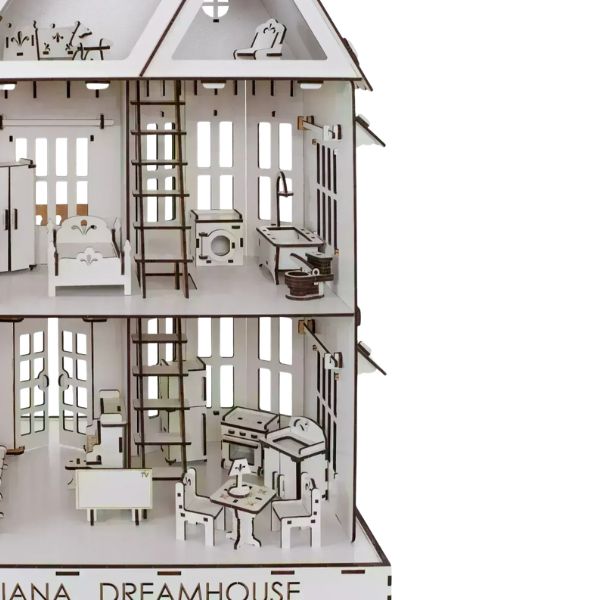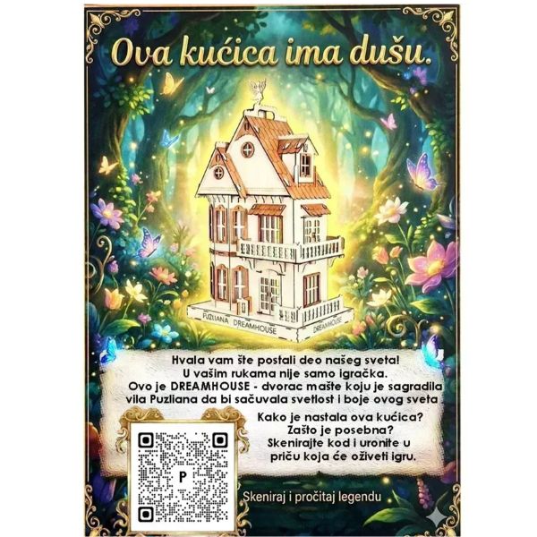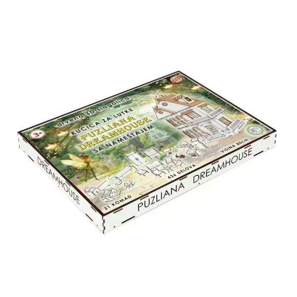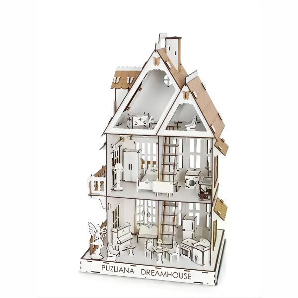Delovi su laserski sečeni sa visokom tačnošću i nalaze se u okvirima na pločama, što garantuje potpunu kompletnost i savršeno uklapanje. Zahvaljujući pedantnoj obradi, svaki element leže na svoje mesto, pružajući osećaj kvaliteta i trajnosti. Sva vrata se zaista otvaraju! Na vrhu krova nalazi se udobna, ergonomski oblikovana ručka. Jasno i slikovito uputstvo: lepo dizajnirano, korak po korak jasno i pregledno, tako da ga svako može pratiti. Kućica je projektovana za lako sklapanje – bez muke i nerviranja, samo čista zabava. Idealan projekat za roditelja i dete. Sklapanje postaje dragocen trenutak zajedničkog stvaranja i kvalitetno provedeno vreme. Spremna za poklanjanje: upakovana je u kompaktnu kutiju – idealnu za transport i spremnu da obraduje najdraže. Šta je unutra? Kućica PUZLIANA DREAMHOUSE, stolice, sto, kreveti, klavir, televizor, veš mašina, kada sa tušem, frižider, sudopera, WC šolja, reran, konjić, podna lampa, stona lampa. Za lutke do 15 cm.