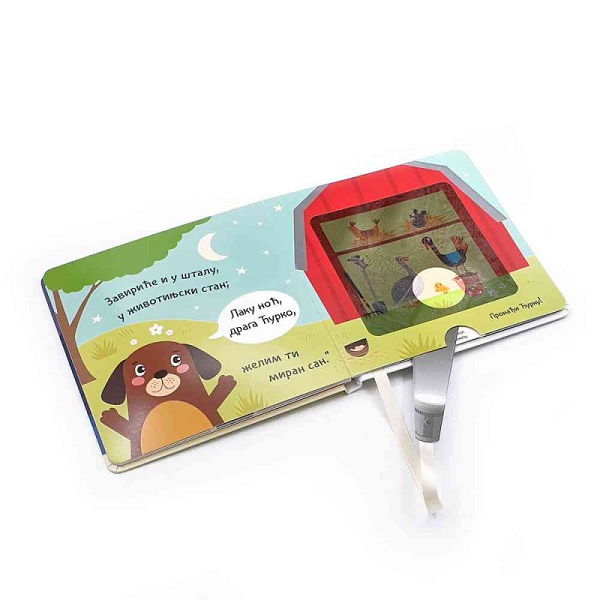 „Laku noć, laku noć, sanjivi svete, čas je da krenemo u krevete…” Pas je spreman za spavanje, ali prvo će da poželi laku noć svojim prijateljima. Možete li mu pomoći da ih sve pronađe? Pažljivo uvucite magičnu lampu između stranica na označeno mesto, da biste lakše pronašli Kucine prijatelje u mračnoj noći. Pismo: Ćirilica. Format: 20,5×21 cm. Obim: 12 str. Kolor: u boji.
