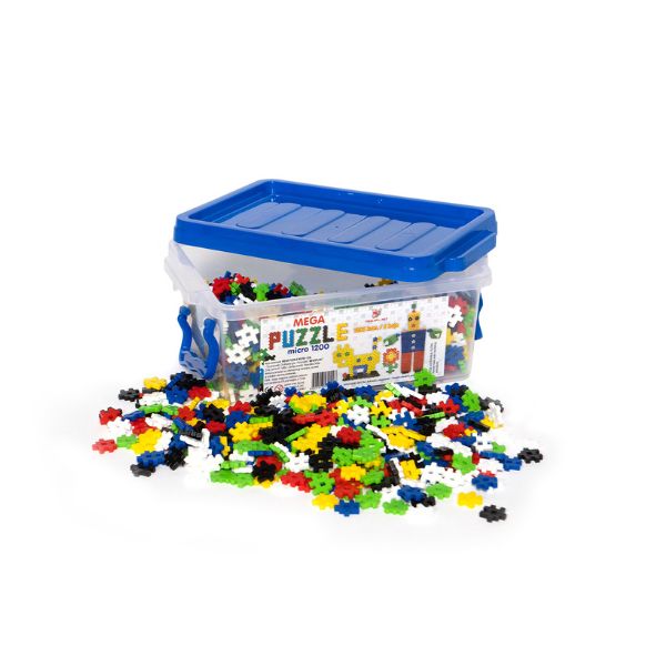 Mega Puzzle su konstruktivno-edukativna igra namenjena deci uzrasta 3+, koja kroz slaganje podstiče razvoj fine motorike, logičkog razmišljanja, prostorne percepcije i kreativnosti. Komplet se sastoji od plastičnog boxa (pakovanja) i 1200 plastičnih puzzli koje se mogu međusobno povezivati po širini, dužini i visini, omogućavajući deci da grade različite oblike i konstrukcije. Puzzle dolaze u šest različitih boja, a elementi su prilagođeni dečijim rukama i lako se uklapaju, što obezbeđuje dugotrajnu i raznovrsnu igru.