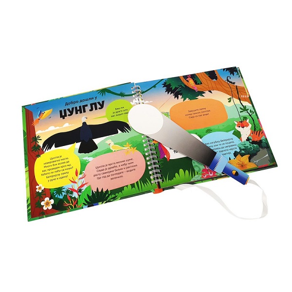 Zabavna “”traži i pronađi”” knjiga za čitanje naglas. Džungla je neverovatno mesto, prepuno različitih vrsta biljaka i drveća, među kojim se krije još više fantastičnih životinja. Sadrži „baterijsku lampu“ napravljenu od čvrstog, belog kartona. Zabavne činjenice o divljim životinjama. Za njuškala starija od 3 godine! Štampa: u boji Povez: kartonska knjiga sa imitacijom baterijske lampe Pismo: ćirilica Dodatak uz knjigu: kartonska baterijska lampa Format: 210 x 210 mm Broj stranica: 14 str.