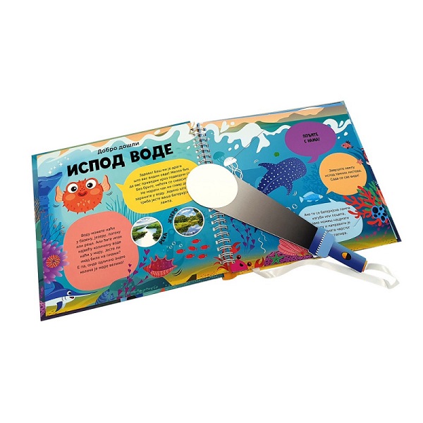 Pod vodom ćeš pronaći mnogo toga: biljke, ribe i školjke neverovatnih boja. Sadrži „baterijsku lampu“ napravljenu od čvrstog, belog kartona. Zabavne činjenice o morskim životinjama. Za njuškala starija od 3 godine! Štampa: u boji Povez: kartonska knjiga sa imitacijom baterijske lampe Pismo: ćirilica Dodatak uz knjigu: kartonska baterijska lampa Format: 210 x 210 mm Broj stranica: 14 str.