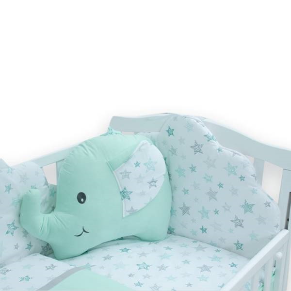 Posteljina sa ogradicom u setu sadrži: dva jastučeta Slonce ( 4×50 cm), 3 x jastuče oblačić (67×45 cm), jastuče za bebinu glavu (60×40 cm), jorgan i jorgansku navlaku (120x80cm), čaršaf sa lastišom (120x60cm). Proizvedeno u Srbiji.