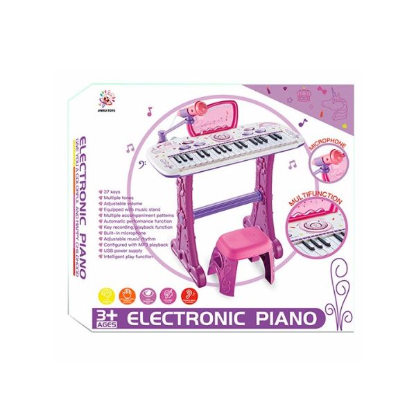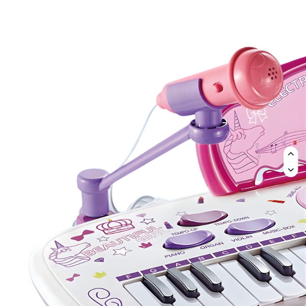 Klavijatura ima 37 elektronskih dirki koje proizvode realističan zvuk klavira. Uključuje stolicu i mikrofon, što omogućava detetu da peva dok svira. Pomaže u razvoju koordinacije ruku i očiju, motoričkih veština i pamćenja, podstičući interesovanje za muziku.