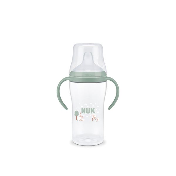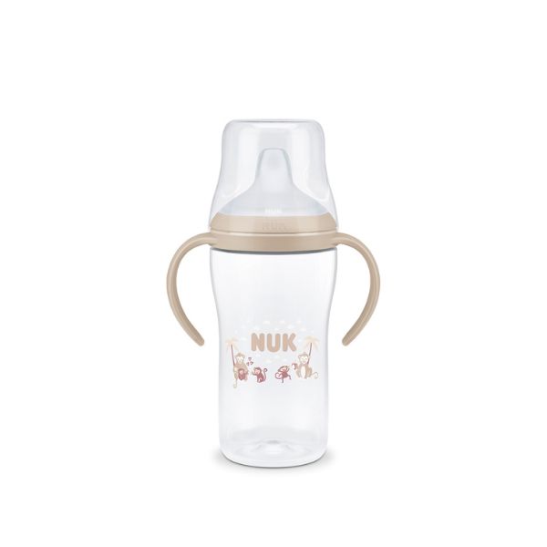 NUK flašica za učenje sa ručkama i indikatorom temperature – Olakšava prelazak sa dojenja ili flašice na samostalno pijenje, sa indikatorom koji pokazuje kada je piće bezbedne temperature. Opremljena ventilom protiv prosipanja, poklopcem sa navojem, mekanim izlivom nežnim prema nepcu i desnima, i ergonomskim ručkama za lako držanje. Napravljena od kvalitetnog, BPA-free materijala i u skladu sa evropskim standardom EN14350, pogodna za uzrast 6+ meseci.