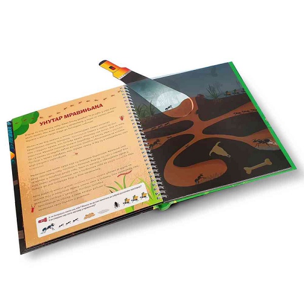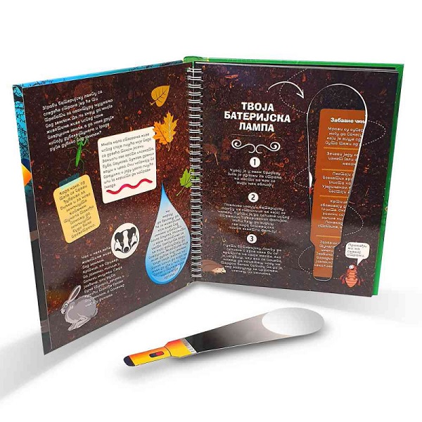 Vesele priče za čitanje naglas sa divnim „traži i pronađi“ ilustracijama. Sadrži „baterijsku lampu“ napravljenu od čvrstog, belog kartona. Zabavne činjenice o šumskim životinjama. Za njuškala starija od 3 godine! Pismo: Ćirilica. Format: 27 x 22 cm. Obim: 14 str. Kolor: u boji. Vrsta korica: kartonska knjiga sa imitacijom baterijske lampe.