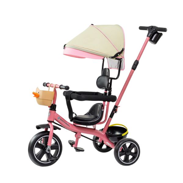 Konstrukcija sa čvrstim metalnim ramom i kvalitetnim plastičnim sedištem i naslonom — idealno za decu koja tek počinju sa vožnjom. EVA tockovi koje pružaju stabilnost i glatku vožnju. Upravljačka ručka za roditelja – omogućava vođenje tricikla dok dete sedi i prati, što čini ovaj model pogodnim i dok je dete još malo za samostalnu vožnju. Zaštitni pojas i obruč oko sedišta — doprinosi većoj sigurnosti, sprečava klizanje ili ispadanje. Tenda – štiti od sunca i omogućava prijatnu vožnju. Korpica na prednjem delu – praktična za čuvanje igračaka ili flašice za vodu. Mogućnost prebacivanja u „samostalni“ režim kada dete dovoljno poraste i može samo da vozi — omogućava duže korišćenje tricikla kako dete raste. Nosivost do 20kg.