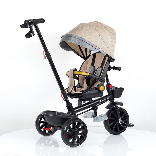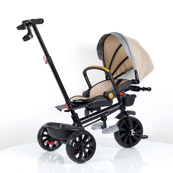 Lagane nijanse zelene boje donose osveženje u svakodnevne šetnje. Ovaj tricikl nije samo lep – on je savršeno funkcionalan, udoban i prilagodljiv detetu koje raste. Rotirajuće sedište (360°). Lak prelazak između pogleda ka roditelju i samostalne vožnje. Naslon se lako i brzo spušta u ležeći položaj, idealan za odmor, dok se mali držači za noge koji se nalaze ispod sedišta mogu lako izvući i pružiti dodatnu udobnost dok je dete u ležećem položaju. Udobno, prijatno i lako za održavanje. Pojas se brzo podešava i drži dete bezbedno u svakom trenutku. Podesiva drška i držač za flašicu. Dva nivoa visine drške za lakše guranje, sa dodatnim prostorom za flašicu. EVA Točkovi 10″ i 8″ sa stop funkcijom. Prednji točak od 10″ I zadnji 8″ pružiće stabilnost na svakom terenu. Kada poželite da stanete potrebno je da samo kliknite stop dugme (crvene boje) na zadnjim točkovima. Kada dete poraste, lako se skidaju: tenda, drška, držač za noge i obe korpe. Tricikl tada postaje jednostavan za samostalnu vožnju.